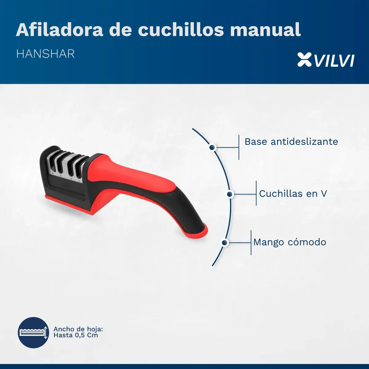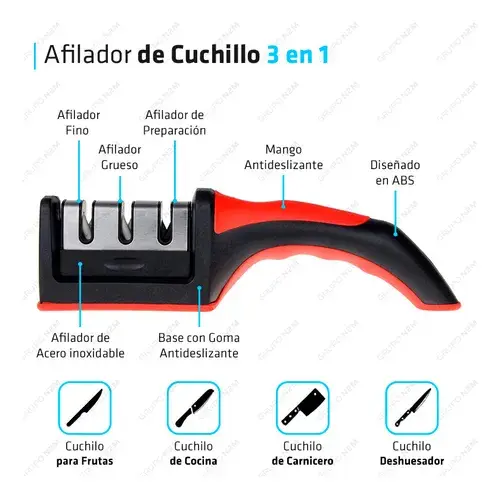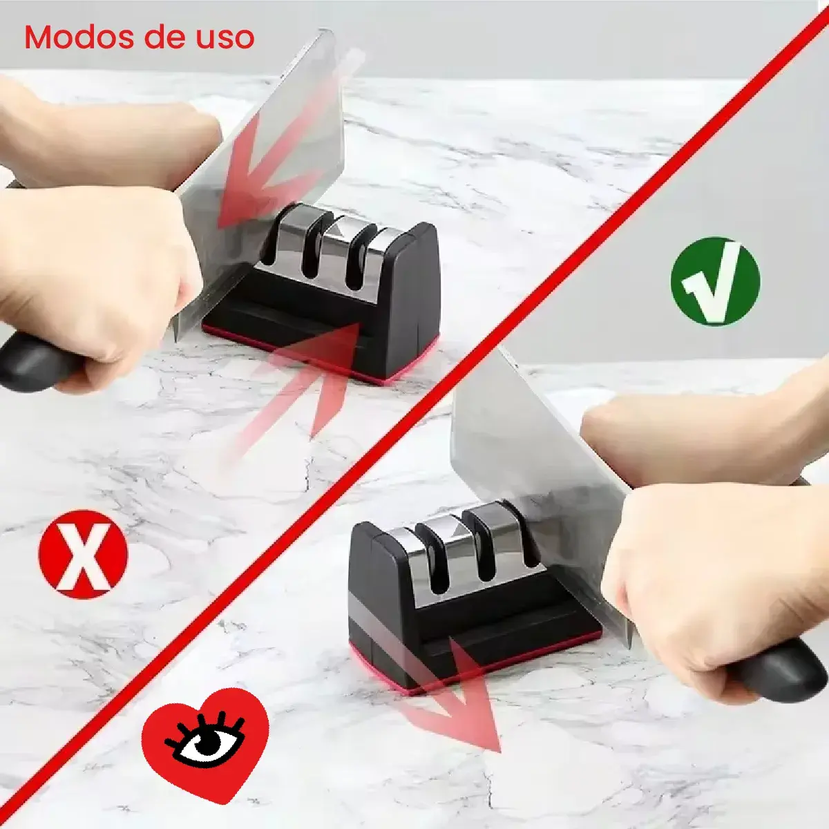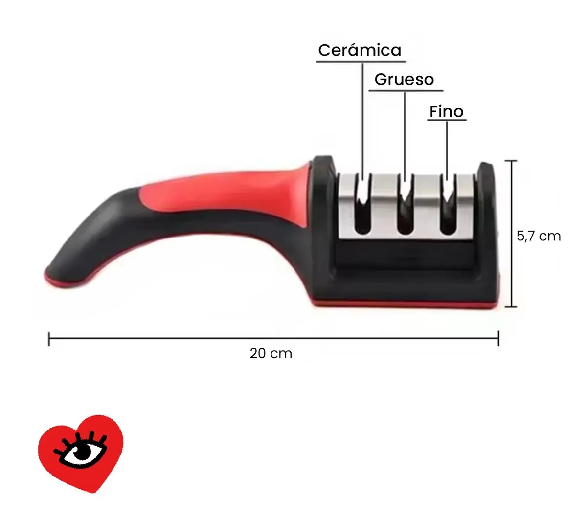 Mantén tus cuchillos siempre listos en tres simples etapas: preparación, afilado fino y pulido final. Su diseño compacto y ligero con base antideslizante y mango ergonómico garantiza un uso seguro y cómodo.