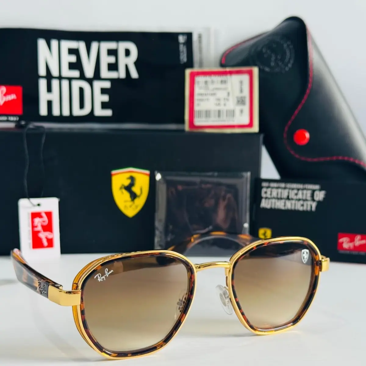 Los Ray-Ban Scuderia Ferrari Dorado Carey representan la perfecta unión entre el diseño sofisticado de Ray-Ban y la energía deportiva, precisa y elegante de la Scuderia Ferrari. Este modelo destaca por su estética de lujo, su calidad superior y sus detalles icónicos inspirados en el mundo del automovilismo de élite.
